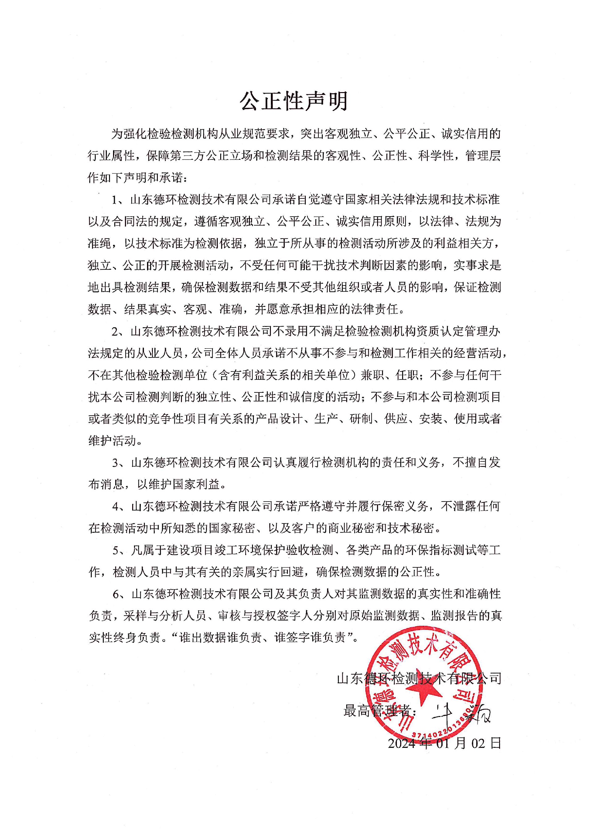 為強(qiáng)化檢驗(yàn)檢測機(jī)構(gòu)從業(yè)規(guī)范要求,突出客觀獨(dú)立、公平公正、誠實(shí)信用的行業(yè)屬性,保障第三方公正立場和檢測結(jié)果的客觀性、公正性、科學(xué)性,管理層作如下聲明和承諾: 1、山東德環(huán)檢測技術(shù)有限公司承諾自覺遵守國家相關(guān)法律法規(guī)和技術(shù)標(biāo)準(zhǔn)以及合同法的規(guī)定,遵循客觀獨(dú)立、公平公正、誠實(shí)信用原則,以法律、法規(guī)為準(zhǔn)繩,以技術(shù)標(biāo)準(zhǔn)為檢測依據(jù),獨(dú)立于所從事的檢測活動(dòng)所涉及的利益相關(guān)方,獨(dú)立、公正的開展檢測活動(dòng),不受任何可能干擾技術(shù)判斷因素的影響,實(shí)事求是地出具檢測結(jié)果,確保檢測數(shù)據(jù)和結(jié)果不受其他組織或者人員的影響,保證檢測數(shù)據(jù)、結(jié)果真實(shí)、客觀、準(zhǔn)確,并愿意承擔(dān)相應(yīng)的法律責(zé)任。 2、山東德環(huán)檢測技術(shù)有限公司不錄用不滿足檢驗(yàn)檢測機(jī)構(gòu)資質(zhì)認(rèn)定管理辦法規(guī)定的從業(yè)人員,公司全體人員承諾不從事不參與和檢測工作相關(guān)的經(jīng)營活動(dòng),不在其他檢驗(yàn)檢測單位(含有利益關(guān)系的相關(guān)單位)兼職、任職;不參與任何干擾本公司檢測判斷的獨(dú)立性、公正性和誠信度的活動(dòng);不參與和本公司檢測項(xiàng)目或者類似的競爭性項(xiàng)目有關(guān)系的產(chǎn)品設(shè)計(jì)、生產(chǎn)、研制、供應(yīng)、安裝、使用或者維護(hù)活動(dòng)。 3、山東德環(huán)檢測技術(shù)有限公司認(rèn)真履行檢測機(jī)構(gòu)的責(zé)任和義務(wù),不擅自發(fā)布消息,以維護(hù)國家利益。 4、山東德環(huán)檢測技術(shù)有限公司承諾嚴(yán)格遵守并履行保密義務(wù),不泄露任何在檢測活動(dòng)中所知悉的國家秘密、以及客戶的商業(yè)秘密和技術(shù)秘密。 5、凡屬于建設(shè)項(xiàng)目竣工環(huán)境保護(hù)驗(yàn)收檢測、各類產(chǎn)品的環(huán)保指標(biāo)測試等工作,檢測人員中與其有關(guān)的親屬實(shí)行回避,確保檢測數(shù)據(jù)的公正性。 6、山東德環(huán)檢測技術(shù)有限公司及其負(fù)責(zé)人對其監(jiān)測數(shù)據(jù)的真實(shí)性和準(zhǔn)確性負(fù)責(zé),采樣與分析人員、審核與授權(quán)簽字人分別對原始監(jiān)測數(shù)據(jù)、監(jiān)測報(bào)告的真實(shí)性終身負(fù)責(zé)?!罢l出數(shù)據(jù)誰負(fù)責(zé)、誰簽字誰負(fù)責(zé)”。 山東德環(huán)檢測技術(shù)有限公司 最高管理者:牛穎